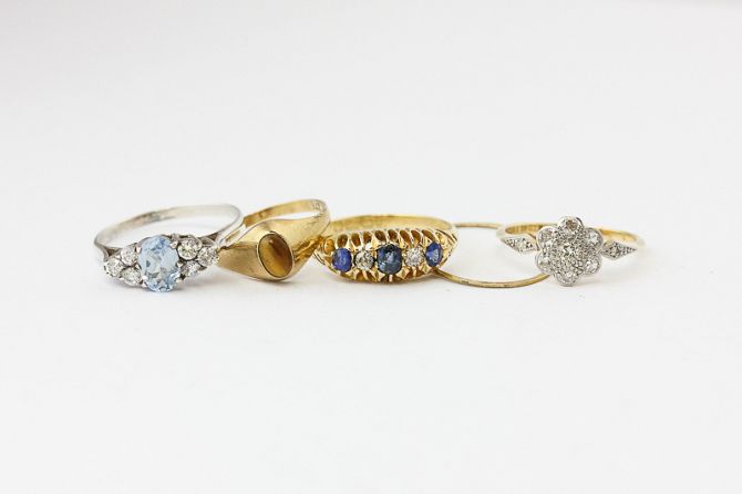 An aquamarine and diamond cluster ring; a diamond cluster ring; a sapphire and diamond ring and a tiger's eye ring