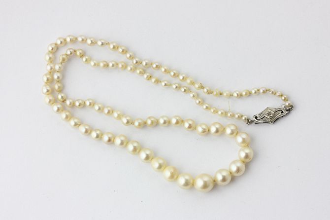 A single row graduated pearl necklace on a 9ct white gold and diamond clasp