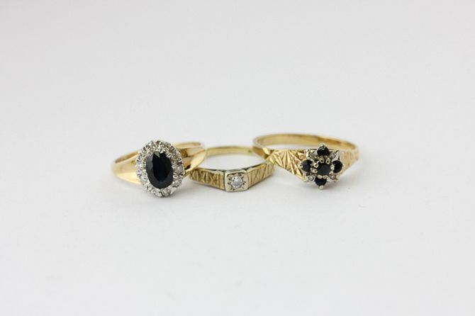 An illusion set diamond single stone ring; two sapphire and diamond cluster rings