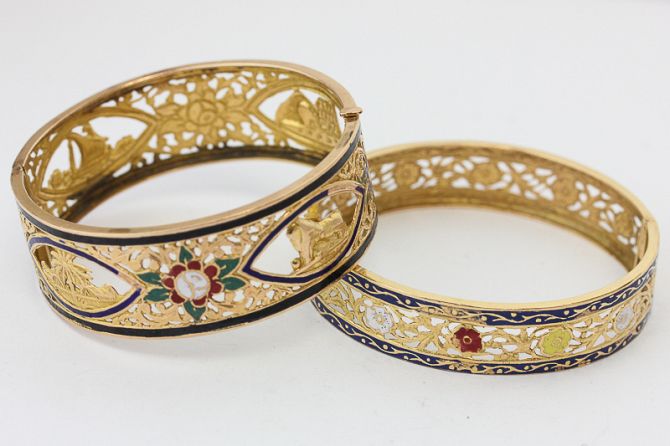 A Middle Eastern gold and enamel hinged bangle; and another smaller, 45g gross