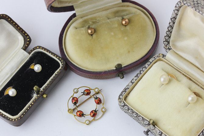 A gold and split pearl circlet brooch with five red and black enamelled ladybirds; two cased sets of gold and pearl collar studs and a cased pair of gold studs