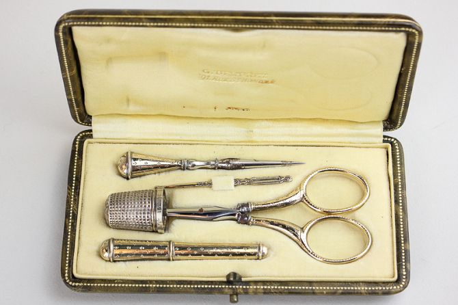 A silver and gilt metal French sewing necessaire of scissors, spike, needle, needle box and thimble, in fitted leather box inscribed G Desprez, 191 Rue St Honore, the lid with gilt initials ARM, 12cm