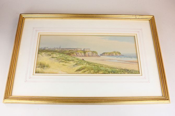 Attributed to D H Pinder, coastal view of Tenby, Pembrokeshire, with seated figures on the dunes, watercolour, 16cm by 36cm