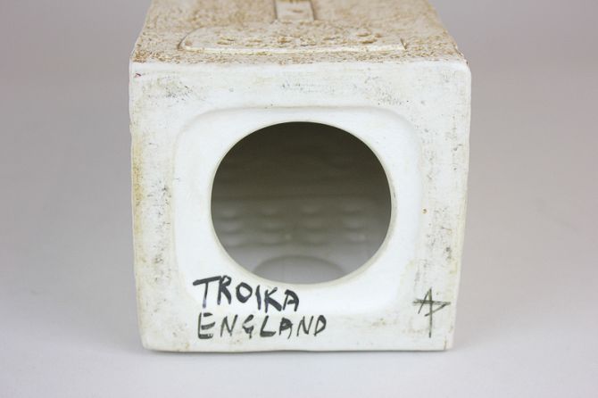 A Troika pottery rectangular lamp base with incised geometric decoration in cream and brown, with piece of wrapping signed by the artist at the time of purchase, 31cm high