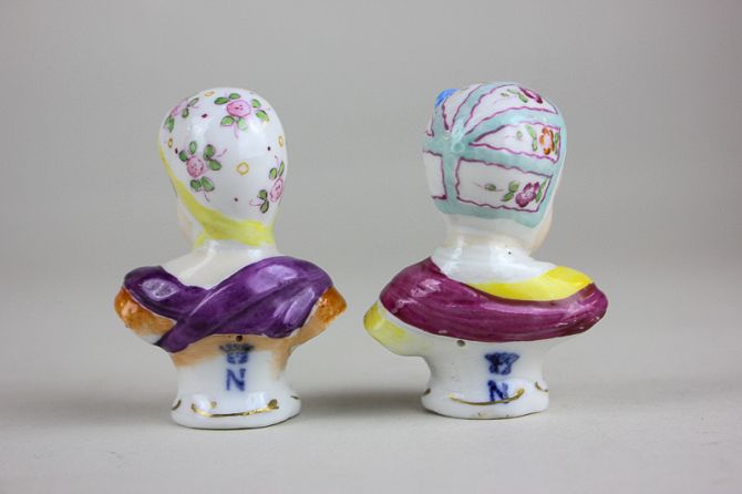 A pair of Naples porcelain miniature busts of women wearing patterned head scarfs, 6cm