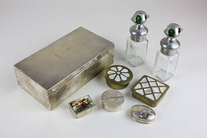 A George V silver cigarette box, three Continental silver snuff boxes, all marked 925, two mother of pearl decorated dressing table boxes and two glass scent bottles with caged marble lid
