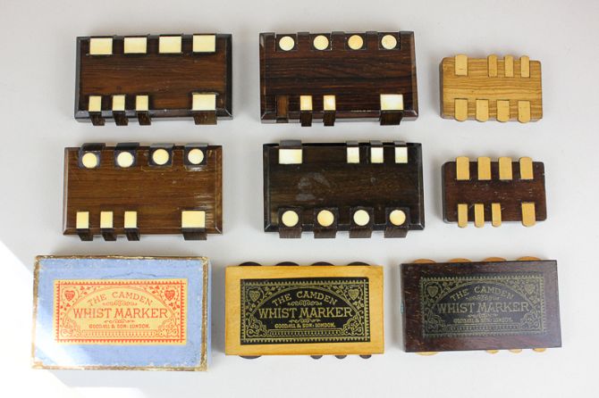 A boxed pair of Camden whist markers, two pairs of Mudies Improved Foster whist markers and another smaller pair of whist markers