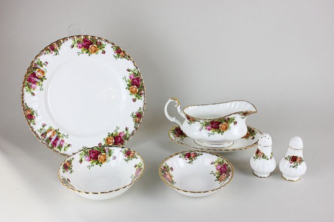 A Royal Albert Old Country Roses part dinner service comprising eight dinner plates, eight dessert bowls, a gravy boat and saucer, salt and pepper and a small bowl