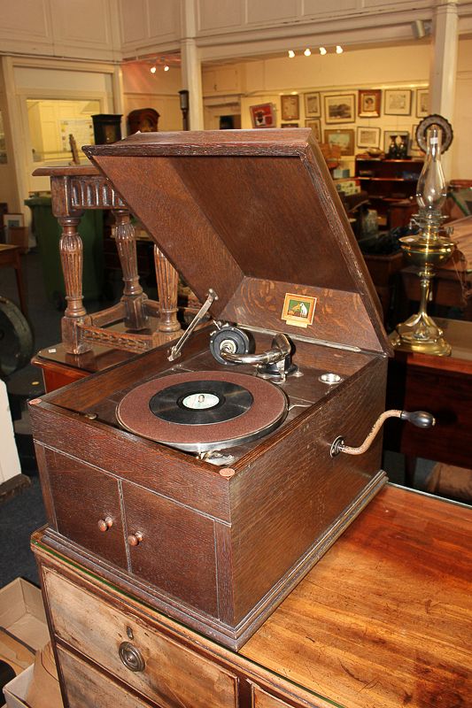 An HMV gramophone record player with winding handle in oak case, and a collection of various records, 38cm