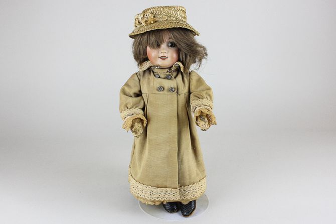 A French Lanternier bisque porcelain head doll with brown hair, brown glass eyes, open mouth and composite limbs, with straw hat, gold coat and shoes, marked AL Cie Limoges, (a/f) 32cm