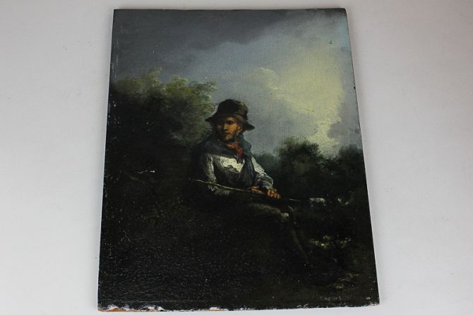 After Moreland, seated shepherd, oil on board, unframed, 30cm by 23cm