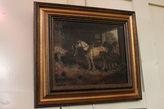 19th century school, dray horses being led into a stable, oil on canvas, 24cm by 29cm
