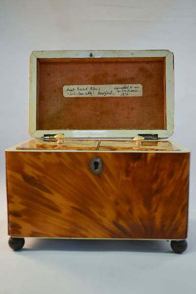 A 19th century blonde tortoiseshell tea caddy with hinged top and two inner caddies on ball feet, 18cm by 11cm