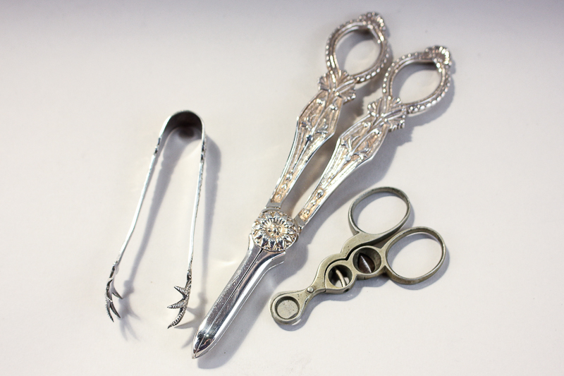 A pair of silver plated grape scissors, a pair of sugar tongs with claw grips and a pair of cigar cutters