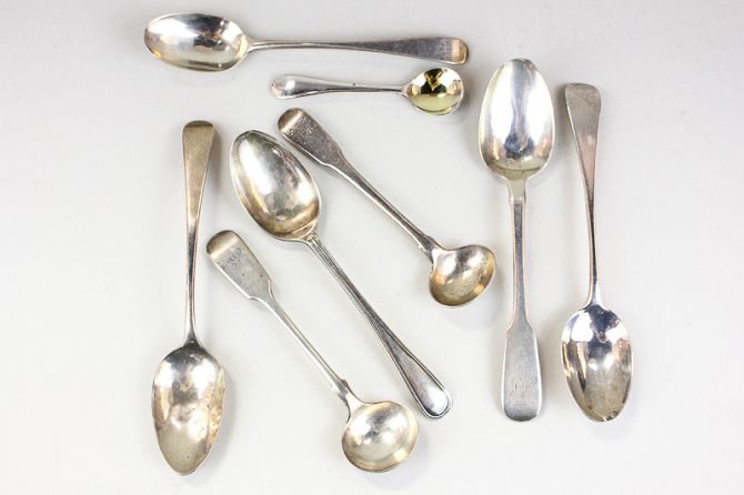Five various silver teaspoons, George III and later, two silver mustard spoons and a plated cruet spoon