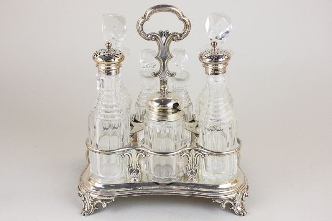A Victorian silver and cut glass seven bottle cruet by Edward & John Barnard, London 1851, comprising four bottles with spouts and stoppers, a silver mounted salt, mustard and pepper, the open stand with scroll feet, 23cm high