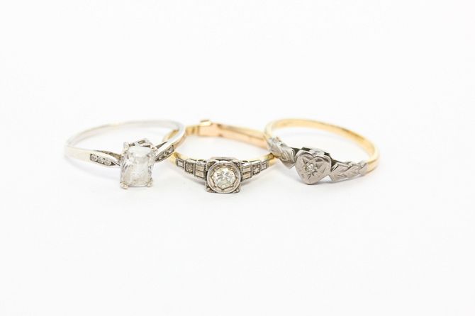 A diamond single stone ring, illusion in platinum on 18ct yellow gold band, an emerald cut cubic zirconia single stone ring with clips to each shoulder on 9ct white gold band, and an illusion set heart ring in platinum on 18ct gold band