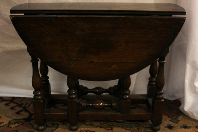 A folding oak oval table with two drop flaps and a square oak stool with padded seat