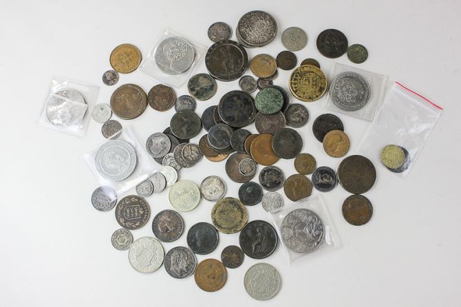 A collection of George II and later British coins including cartwheel pennies, Victorian shillings, sixpences, farthings, etc