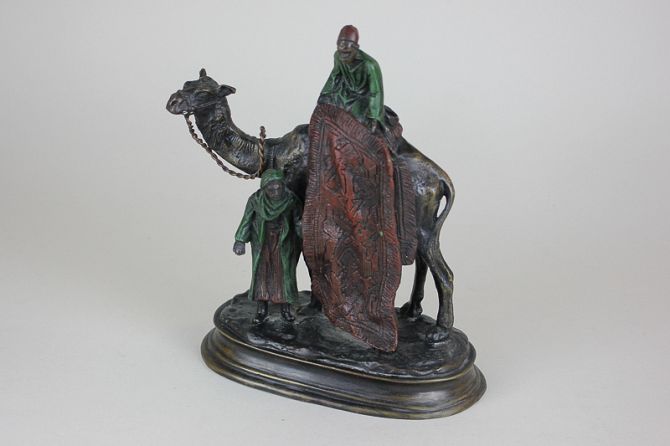 After Kamba, a painted bronze camel group with carpet traders and camel, on oval base, marked C Kamba, 20cm high
