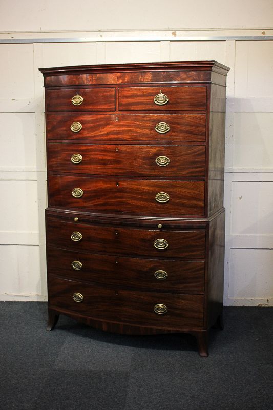 A George III mahogany bow front tallboy chest on chest of two short over three graduated drawers, on base with baize lined brushing slide and three further graduated drawers, on played bracket feet, 126cm