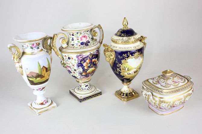A Derby porcelain urn with floral and gilt decoration (a/f), a Coalport commemorative urn and cover depicting the Coronation procession, signed B Higham 115/200, a 19th century sugar bowl and cover and an urn with swan handles (a/f), 22cm