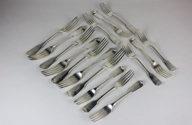 A set of nine William IV silver fiddle pattern dessert forks, maker Mary Chawner, London 1826, together with seven matching table forks, monogrammed, 30oz, (16)