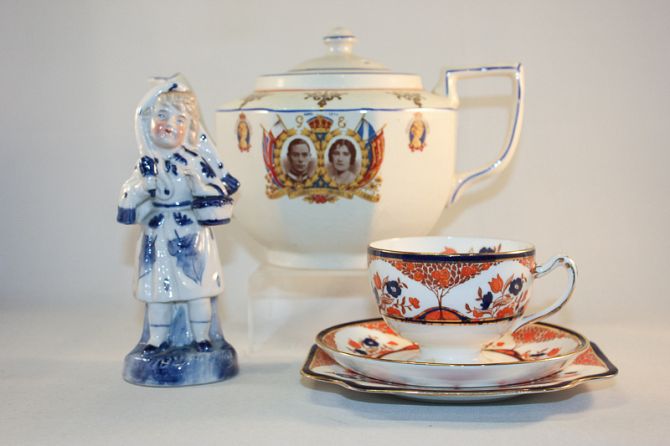 A part Beresford Bros porcelain tea set; three meat plates; a George VI Coronation tea pot and other items