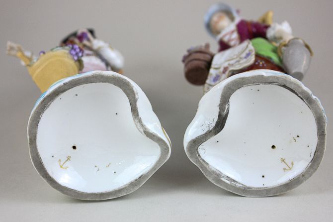 A pair of Samson porcelain figures of fruit pickers, in Derby style, of a man and woman in brightly coloured costumes with grape carriers, standing on gilt scroll bases, with gold anchor mark to base, 20cm