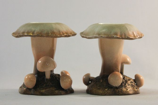 A pair of Moore England porcelain small candlesticks modelled as toadstools on rustic bases (stamped on bases), 7.5cm high