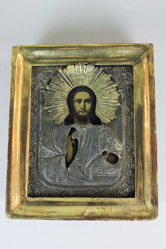 A Russian icon of Christ, late 19th century, with engraved gilt frame and glazed metal oklad display case, 24cm overall height