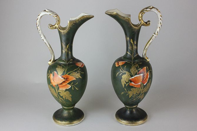 A pair of Victorian porcelain ewers, the baluster form with foliate scroll handles, depicting a poppy on green ground with gilt embellishment, 31cm high