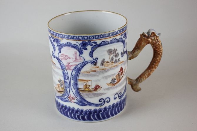 A Chinese porcelain tankard decorated with three scenes of barges on a river, the handle modelled as a fish with scales (a/f), 13.5cm high