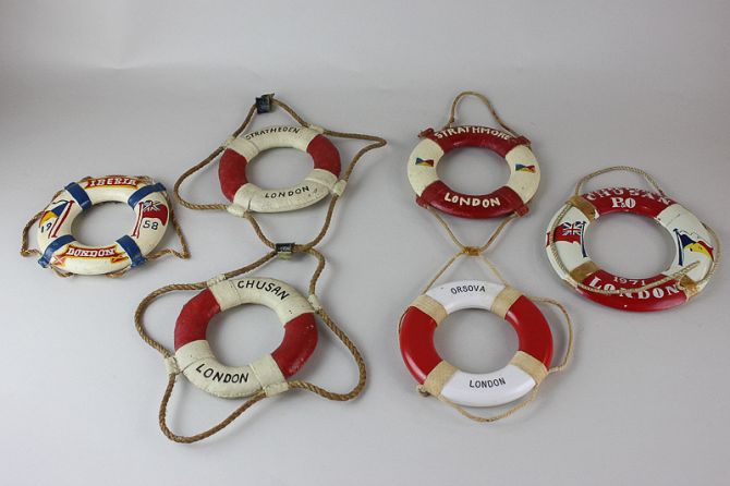 A collection of souvenir lifebelts marked Iberia 1958 London, Strathmore Orsova London, Stratheden Chrisan London, and Peter Pudney Chuscan P & O 1971 London