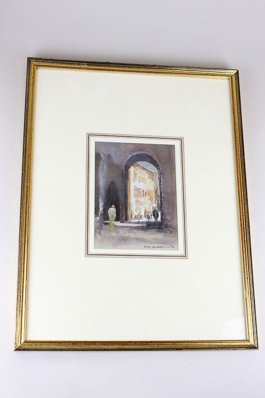 Roy Hammond (b 1934), figures walking through an arch, A City Gateway, Assisi, watercolour, signed and dated '02, Chris Beetles Gallery label verso, 15.5cm by 11.5cm