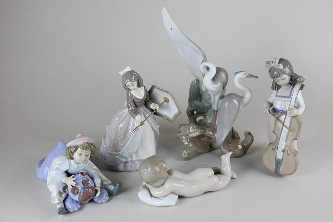 Three Lladro porcelain figures, girl with umbrella, little girl sitting on a large teddy bear, and sleeping child together with two Nao figures, a girl playing cello and two cranes