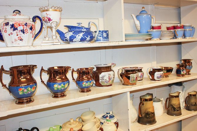 A collection of eight 19th century and later gold lustre ware jugs, four depicting figures titled Charity, Hope and Faith, together with a similar bowl and vase (a/f)
