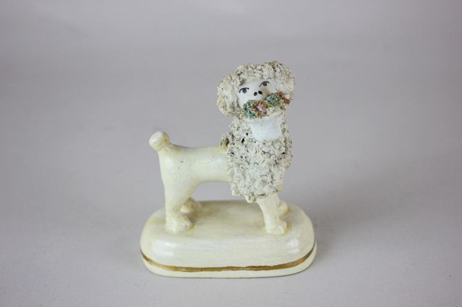 A Staffordshire pottery poodle ornament holding a basket of flowers in his mouth (a/f - restored), 8cm high
