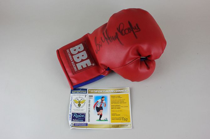 A BBE Britannia boxing glove signed by Sir Henry Cooper, bought from an auction of sports memorabilia during the seventh Annual Sportsmans Dinner, Felbridge Hotel, East Grinstead