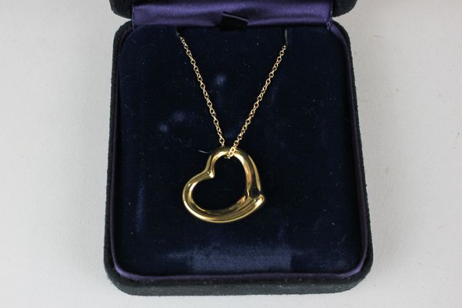 A Tiffany 18ct gold heart pendant designed by Elsa Peretti on trace link chain