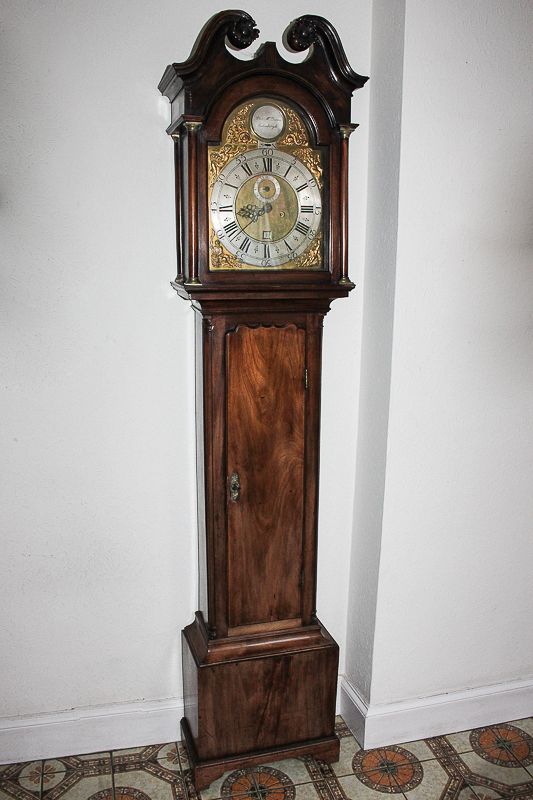 A George III Scottish mahogany longcase clock, Alex McQueen, Edinburgh, the hood with swan's neck pediment and arch glazed panelled door incorporating column sides, the trunk with long door and shaped top, on rectangular base, the 12inch arch brass dial with silverised chapter ring and Roman and Arabic numerals, with date and seconds indicators and the four seasons figure spandrels with strike/silent lever and maker's name in arch, the eight-day movement striking on a bell, 207cm high