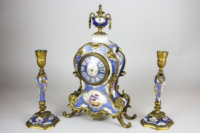 A 19th century French style ormolu and porcelain clock garniture, with Sevres style bird and floral panel decoration on blue and gilt ground, the waisted form with ormolu scrolling design and urn finial, the painted dial with Roman numerals marked W. H. Glenny Sons & Co, Buffalo (retailers New York) with two matching candlesticks (one a/f) 19cm high