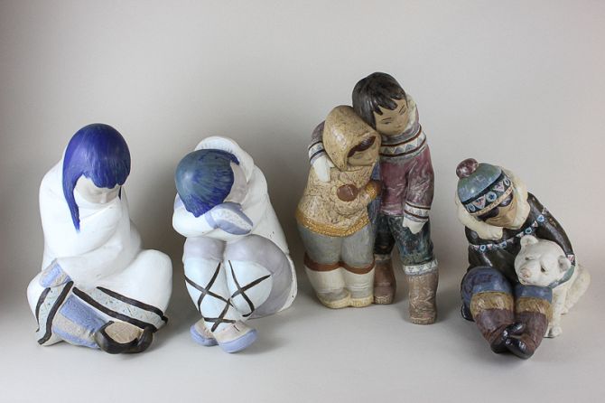 Four Lladro pottery figures of Inuit children, including a boy hugging a polar bear