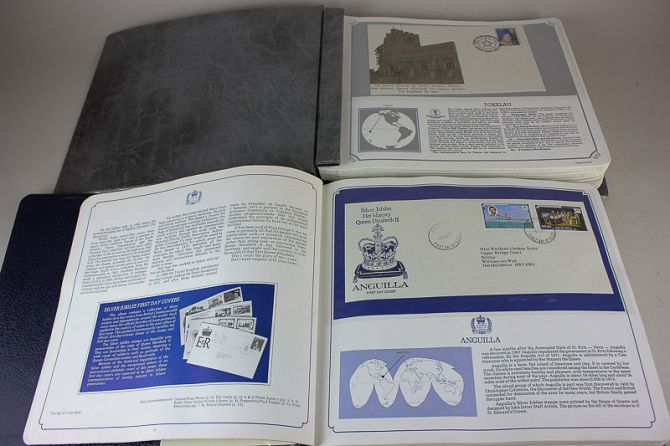Two Royal Commemorative first day cover postage stamp albums issued by the Postal Heritage Society 1977, and another 1953-78 25th Anniversary of the Coronation (the Gilbert Islands missing)
