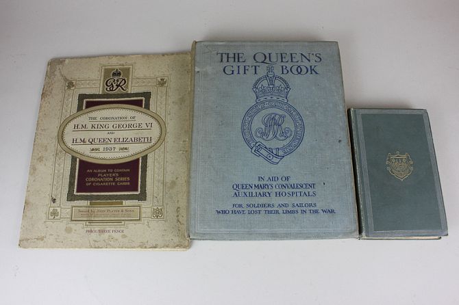 The Queen's gift book in aid of Queen Mary's convalescent auxillary hospitals, for soldiers and sailors who have lost their limbs in the war, stamped HMS Hermione inside front cover, published Hodder & Stoughton; a Players Coronation series cigarette album for King George VI and Queen Elizabeth and Derbyshire by J. Charles Cox, illustrated by J. Charles Wall, pub. Methuen & Co London, 1905 (3)