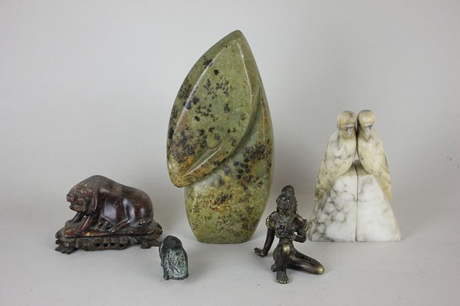 A soap stone carving of a sow, on carved wooden base, a bronze figure of a female deity, a pair of carved stone parrots, an abstract stone carving and a metal animal