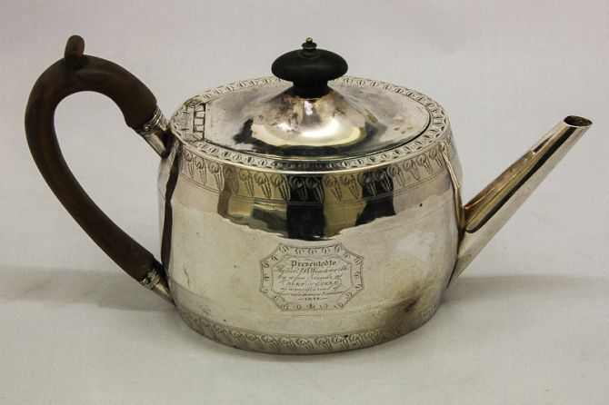 A George III silver tea pot, maker Henry Chawner, London 1790, the oval body with engraved band to top and base with hinged lid and wooden handle, 13oz gross (presented)
