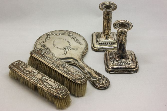 A silver back hand mirror and two matching clothes brushes and a pair of silver matching candlesticks, Birmingham 1906