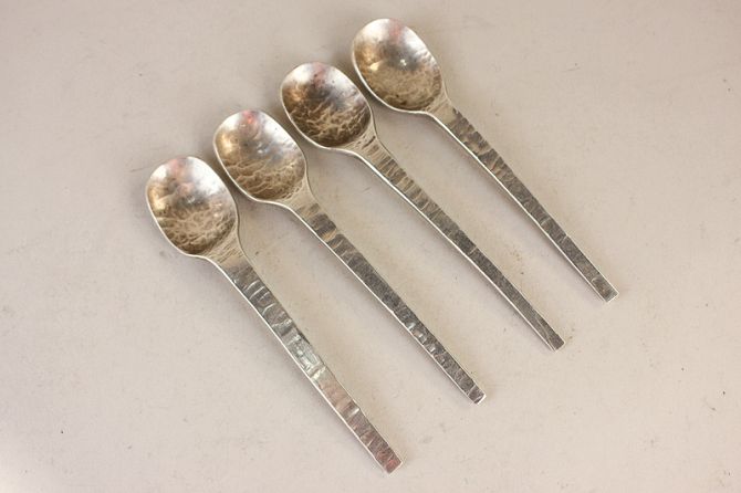 A set of four modern silver spoons, rustic style with hammered bowls and handles, maker PJH, London 1991, 7oz