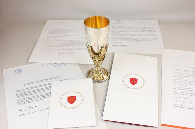 A limited edition Royal Wedding commemorative silver gilt goblet, the stem mounted with three griffins holding shields, base inscribed number 287 of 1000, made by order of the Dean and Chapter of St Paul's to commemorate the wedding of HRH the Prince of Wales and Lady Diana Spencer, 1981, Aurum Design, 12oz, with paperwork, 17cm